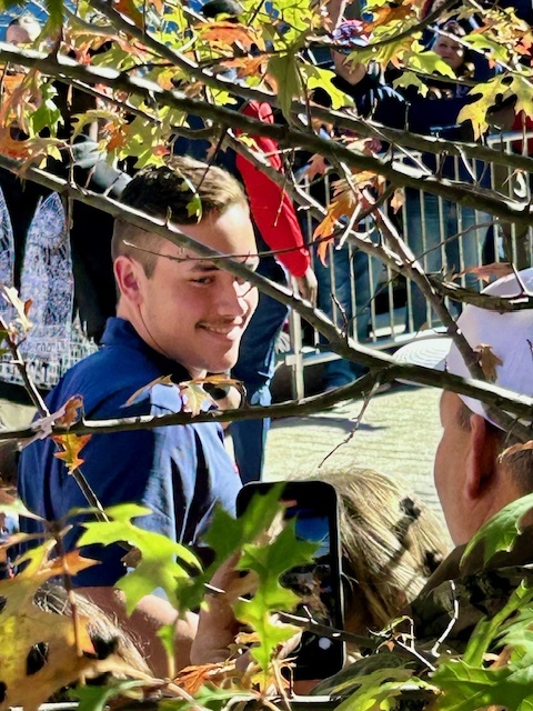 Ole Miss freshman reserve long snapper, Caleb Blankenship, visits with his family during the Walk of Champions prior to the 2024 Egg Bowl.