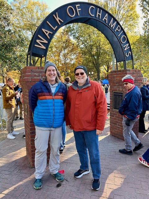 Wayne and Doug strike a pose under the Walk of Champions archway.